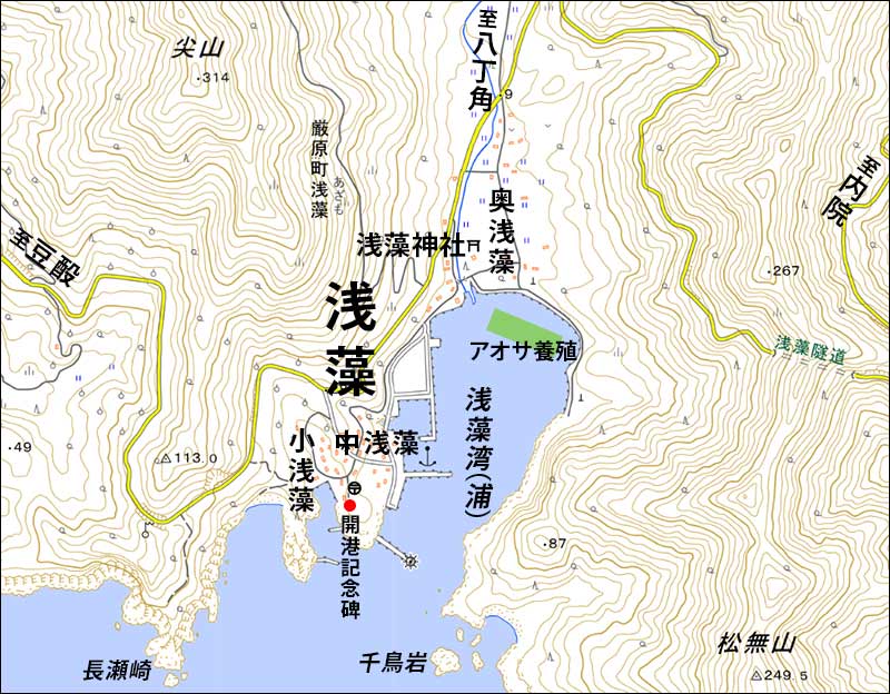 【地名の由来】浅藻の「藻」は「浦」の意で、浅い浦ということらしい。港を開く際に、大岩を沖に捨てたということからもうなずける。