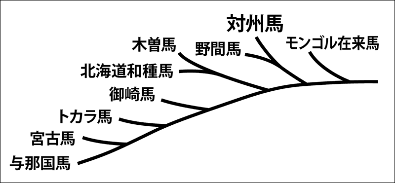 日本在来馬8品種と世界の32品種のDNAを比較すると、日本在来馬は、モンゴル在来馬の祖先が対馬を経由して輸入され、全国に広がったと考えられるそうだ。まず対州馬と野間馬(愛媛県)が分岐し、ここから北海道まで北上するグループと、沖縄まで南下するグループに分かれたという。