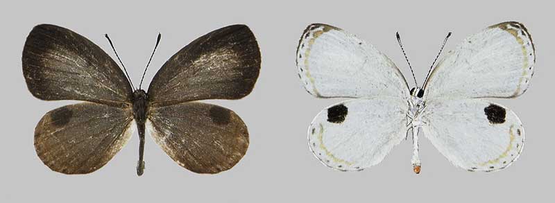 ツシマウラボシシジミは、国内に生息している蝶としては最小の部類で、前翅長が1~1.5cmほど。オスの翅表は熱帯の蝶らしく鮮やかな青色に輝き、メスは地味目の黒色~灰色。翅裏は雌雄ともその和名の由来でもある、白の地に黒い星(斑紋)があり、注意深く見れば誰にでもそれとわかるそうだ。
