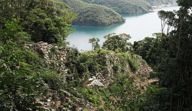城山は標高273m、北側と西側に峻厳な岩壁をもつ、対馬では珍しい岩の山だ。見るからに攻めるに難しいと、敵を圧する山容だ。この天然の要害を利して、自然の断崖に加え全長2.4kmの城壁を巡らし、城内を囲んだ。