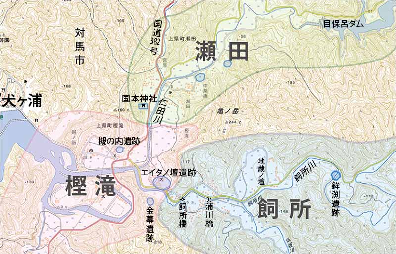 飼所川上流に銅矛を祀っていた磐座があり、弥生時代終末期のものと推定されている。終末期とは、2世紀後半から3世紀中頃に当たり、『魏志倭人伝』に「倭国大乱」「邪馬台国」などと記された時代のことだ。この頃から古墳時代にかけて、大陸から数百万人の渡来人が九州や本州に移住し、その多くが対馬を通過していったと言われている。
