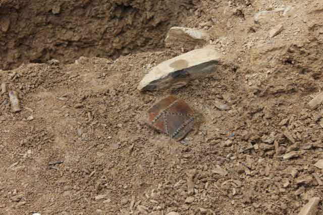 (上)2017年の発掘調査で、韓国のものと同じ隆起文の土器や日本の石材で作られた石器などが出土 (下)石で四角く囲った「炉」も発掘 写真:古場公章氏