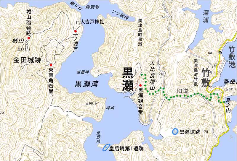 城山は西側の斜面を除いてほとんどが、黑瀨の村域となっている。江戸時代であれば、黑瀨村の領地ということになる。それは、黒瀬の人々が金田城の城守りを任せられ、城の守護神である大吉戸神社の祭祀に奉仕してきたことにつながる。