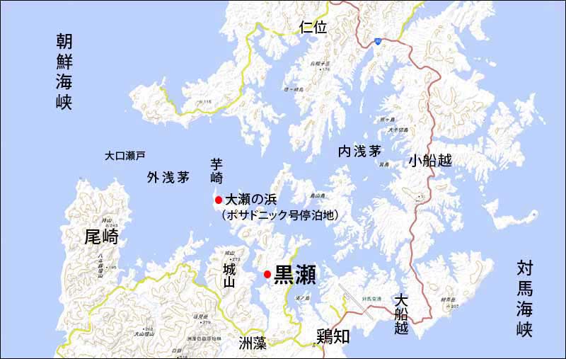 1861年(文久元年)2月、ロシア軍船・ポサドニック号が浅茅湾に入り、湾内での船の修理を申し出た。1カ月後にはポサドニック号は湾内を航行したあと、強引に芋崎浦の「大瀬の浜」に停泊。上陸して小屋を建て、井戸を掘り、最後は土地租借を申し入れてきた。