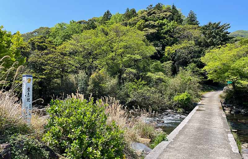 ホタル生息地の標柱と佐須川にかかる沈下橋