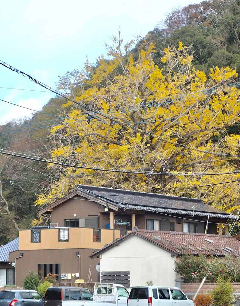 ここのイチョウは雌株で、幹周り6.3m、高さ約10mの、イチョウとしては対馬第2位の巨木だ。おそらく植樹したときは、これほど大きく育つとは想像していなかったのではないだろうか。周囲の空間がかなり窮屈に感じる。