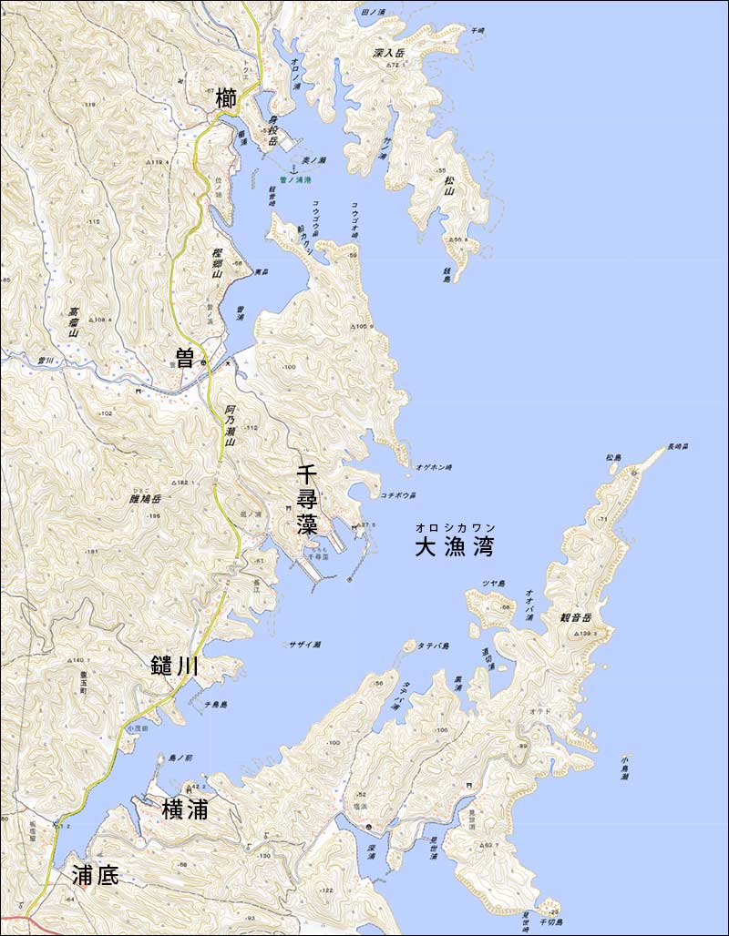 今は「大漁湾」と書いて「おろしかわん」と読ませるが、かつては「於呂志加湾」と書かれたり、「千尋藻浦」と記されることもあった。