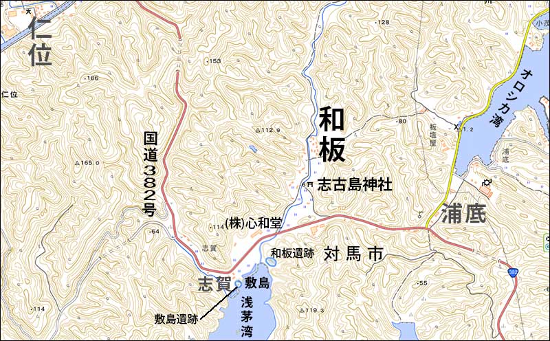 【地名の由来】 かつては「輪板」、「和伊田」、「靄田(あいた)」とも書いたが、元禄の郷村帳に「和板」と書かれ、その後「和板」に統一された。由来は妥当な説がなく不明と書かざるを得ないが、「対馬全カタログ」なりに由来を考えてみた。「わいた」という名字をネットで探すと「淮田(わいだ)」に出会い、その由来を探したが不明。しかし、その意味は「囲む田」「囲まれた田」であり、イメージとしては「潟地に囲いをつくり埋め立てた田畑」。遠浅の入江があったかつての和板には相応しい由来案ではないだろうか。