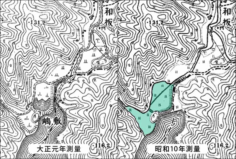 江口新田:大正元年測量と昭和10年測量の地形図を比較。グリーンの部分が荒地から耕作地に変わっており、江口新田と推測できる 出典:国土地理院地形図(一部色彩追加等)