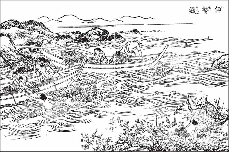江戸中期に発刊された『日本山海名産図会』には、真珠ではないが、伊勢のアワビ漁が掲載されている。真珠採取も同様の光景だっただろう